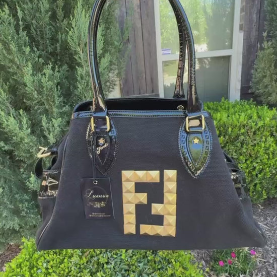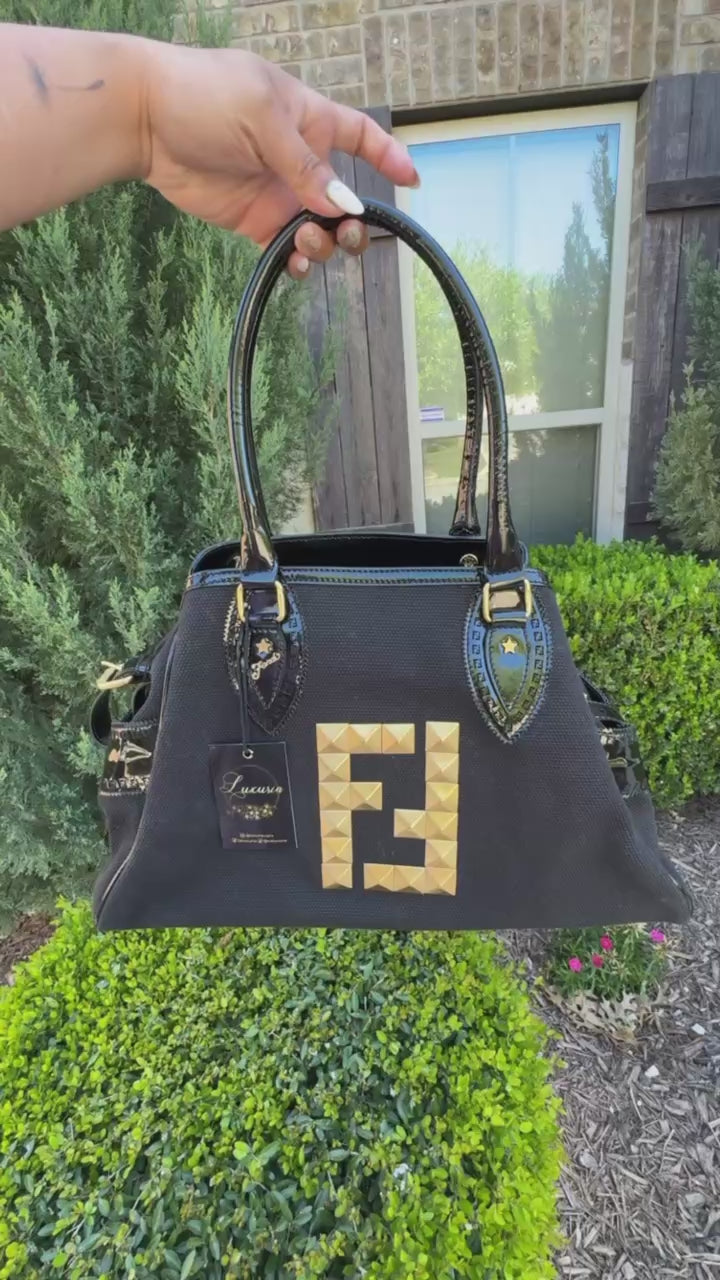 The Fendi Bag Du Jour in black canvas is a compact yet bold piece that combines classic structure with edgy detail. This small handbag features sleek black canvas, leather trim, and silver-tone stud accents for a standout, modern finish. With its structured silhouette, top handles, and signature Fendi hardware, the Bag Du Jour offers timeless appeal with a twist—perfect for day or evening wear.