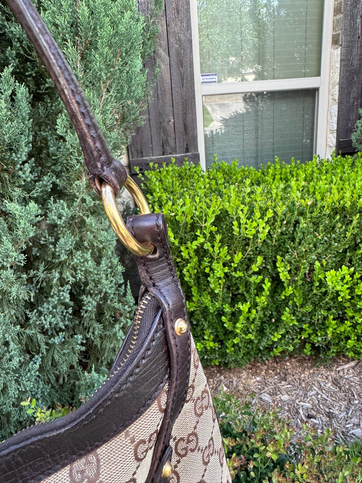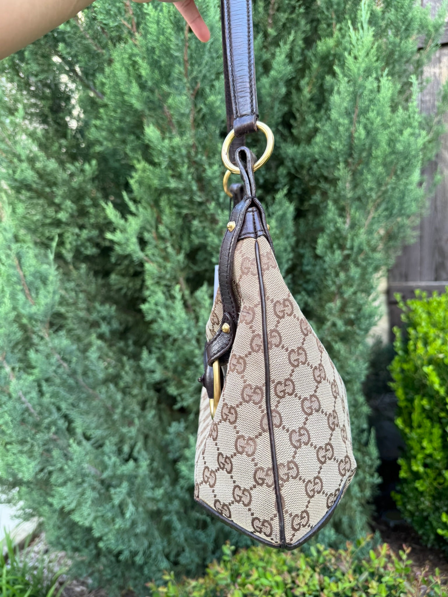 The Gucci GG Canvas Horsebit Shoulder Bag is a classic from the house’s archive, known for its structured crescent shape, signature GG monogram canvas, and bold horsebit hardware. Finished with smooth leather trim and a comfortable shoulder strap, it’s a timeless piece that blends casual wearability with standout branding.