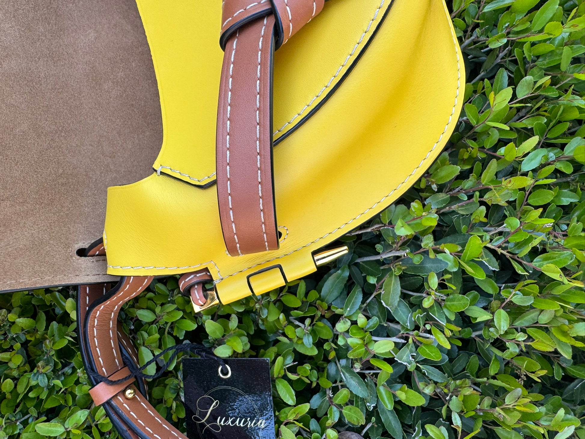 The Loewe Small Gate Bag is a standout piece, known for its saddle silhouette, signature knotted front strap, and sleek craftsmanship. This version in Mocca Yellow and Pecan leather is both bold and versatile, offering a warm, earthy color palette that works year-round. Handcrafted in soft, grained calfskin, the Gate bag features precise stitching, a hidden side-latch closure, and a contrasting suede-lined interior. It’s a compact yet functional crossbody that delivers both elevated design and everyday practicality.