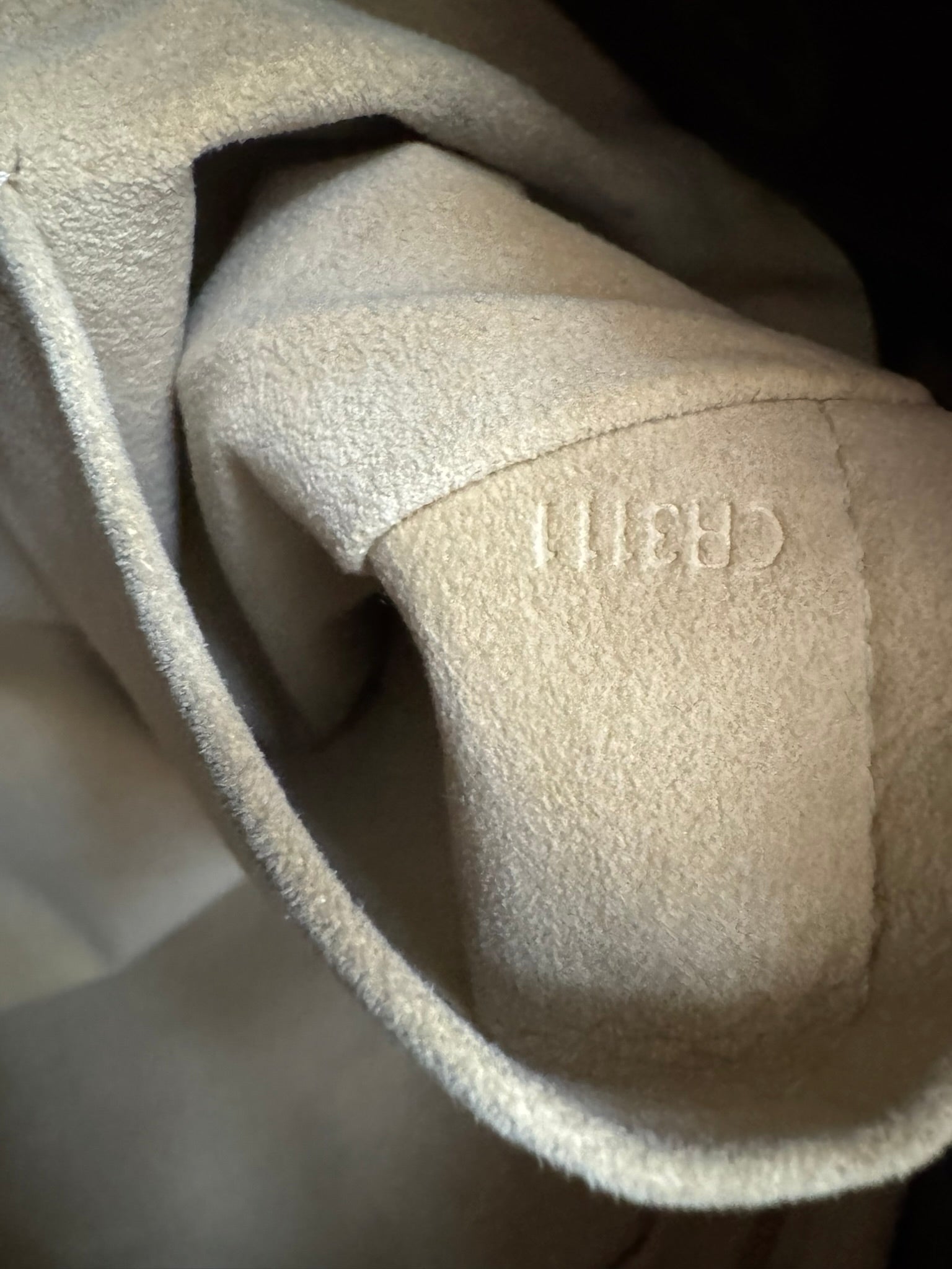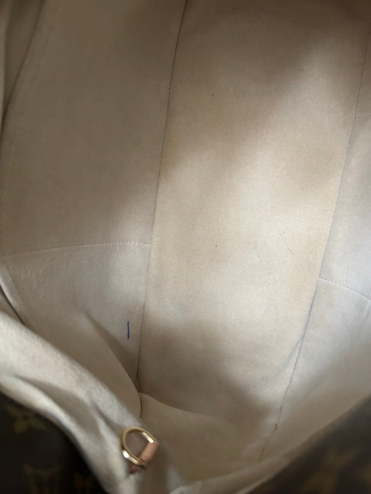 - Vachetta leather has developed a warm honey patina, with some minor watermarks or rubs
