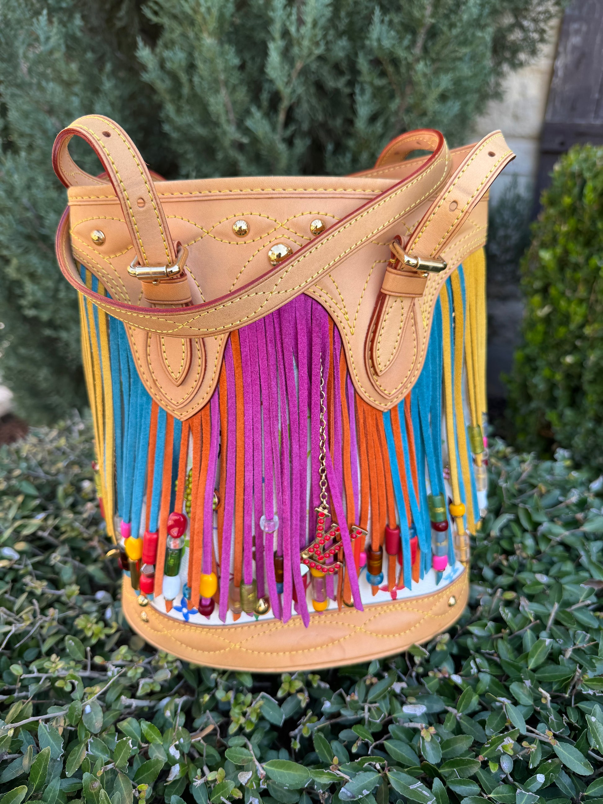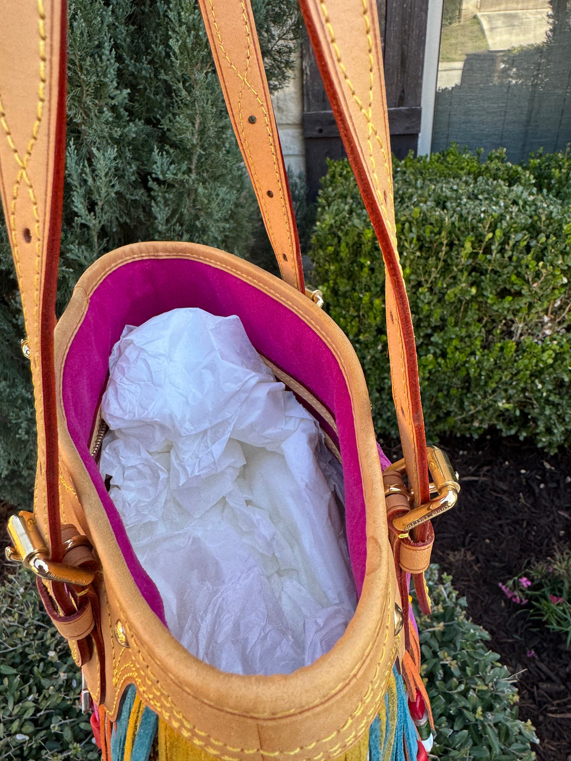 The Louis Vuitton Bucket Fringe in Multicolor Blanc is an exceptionally rare piece, making it a true investment-worthy bag for collectors and fashion enthusiasts alike.