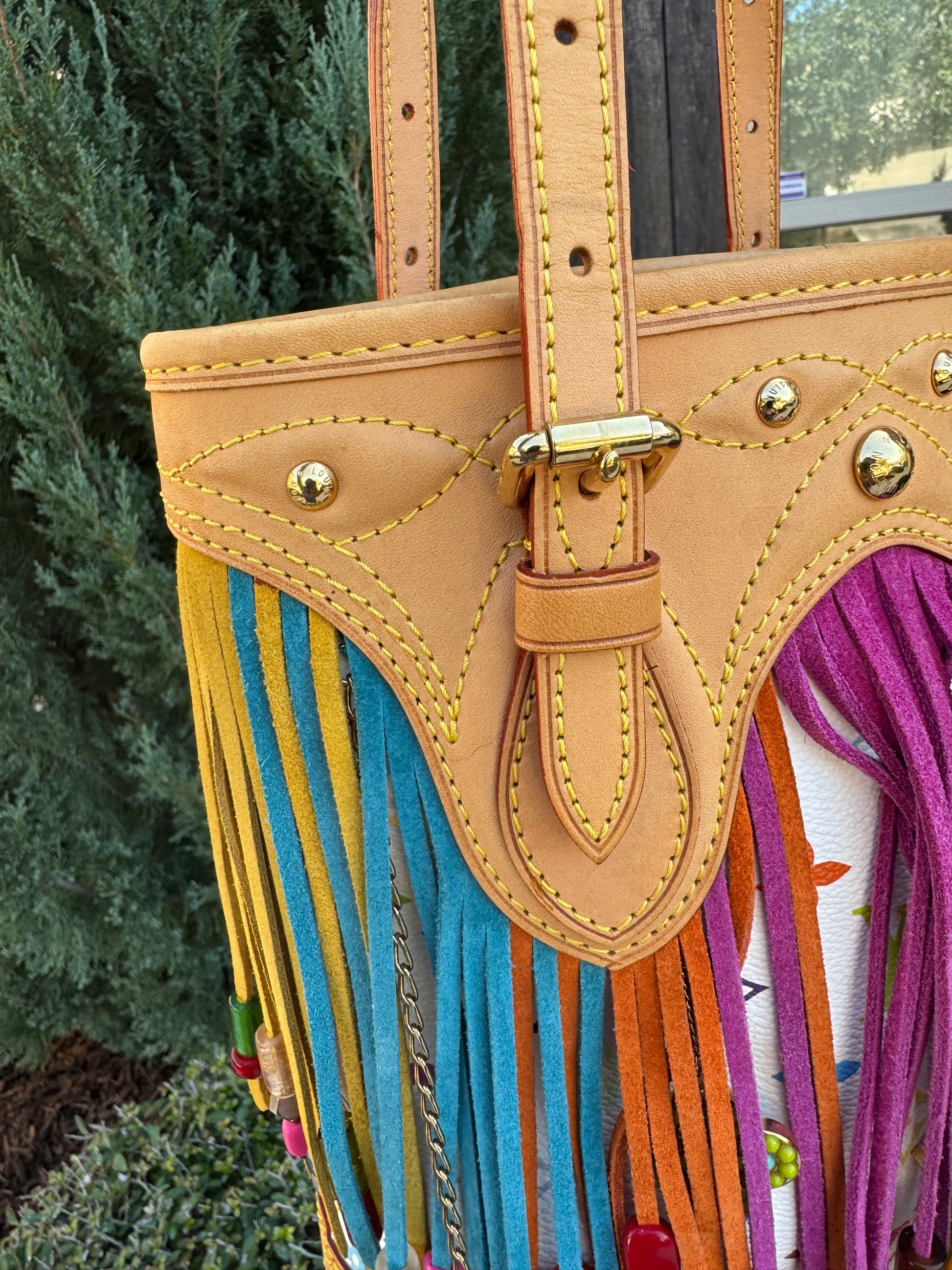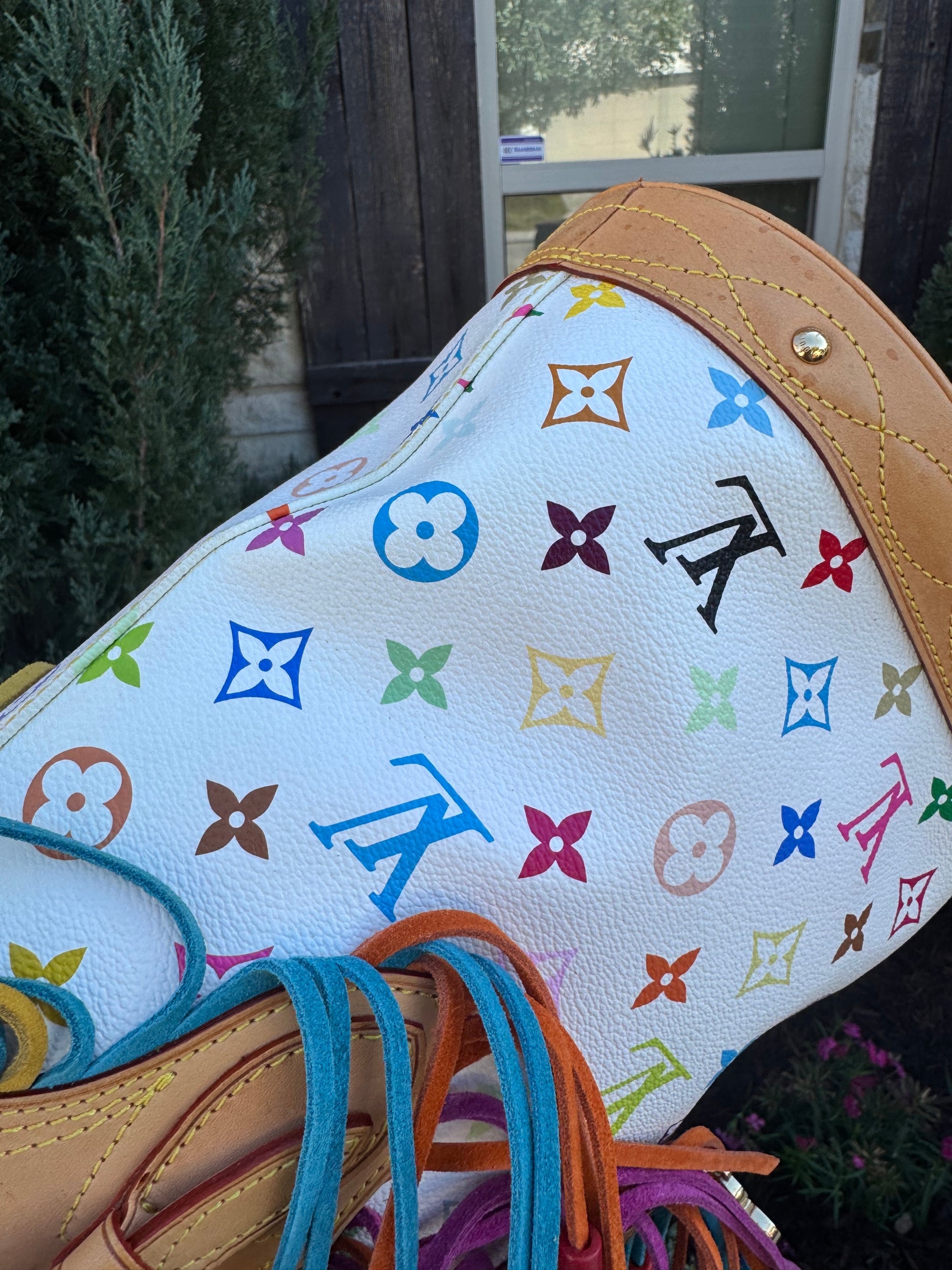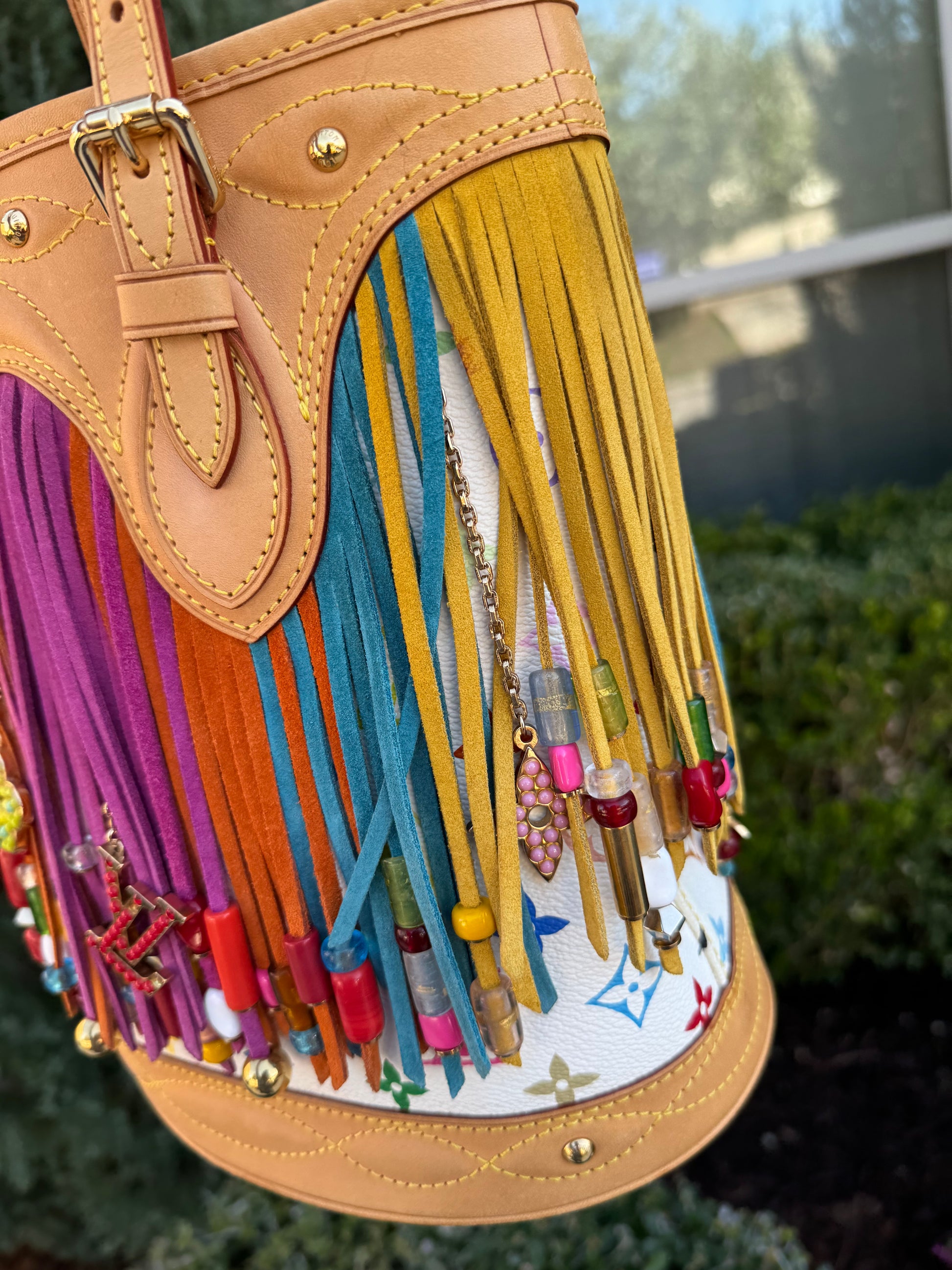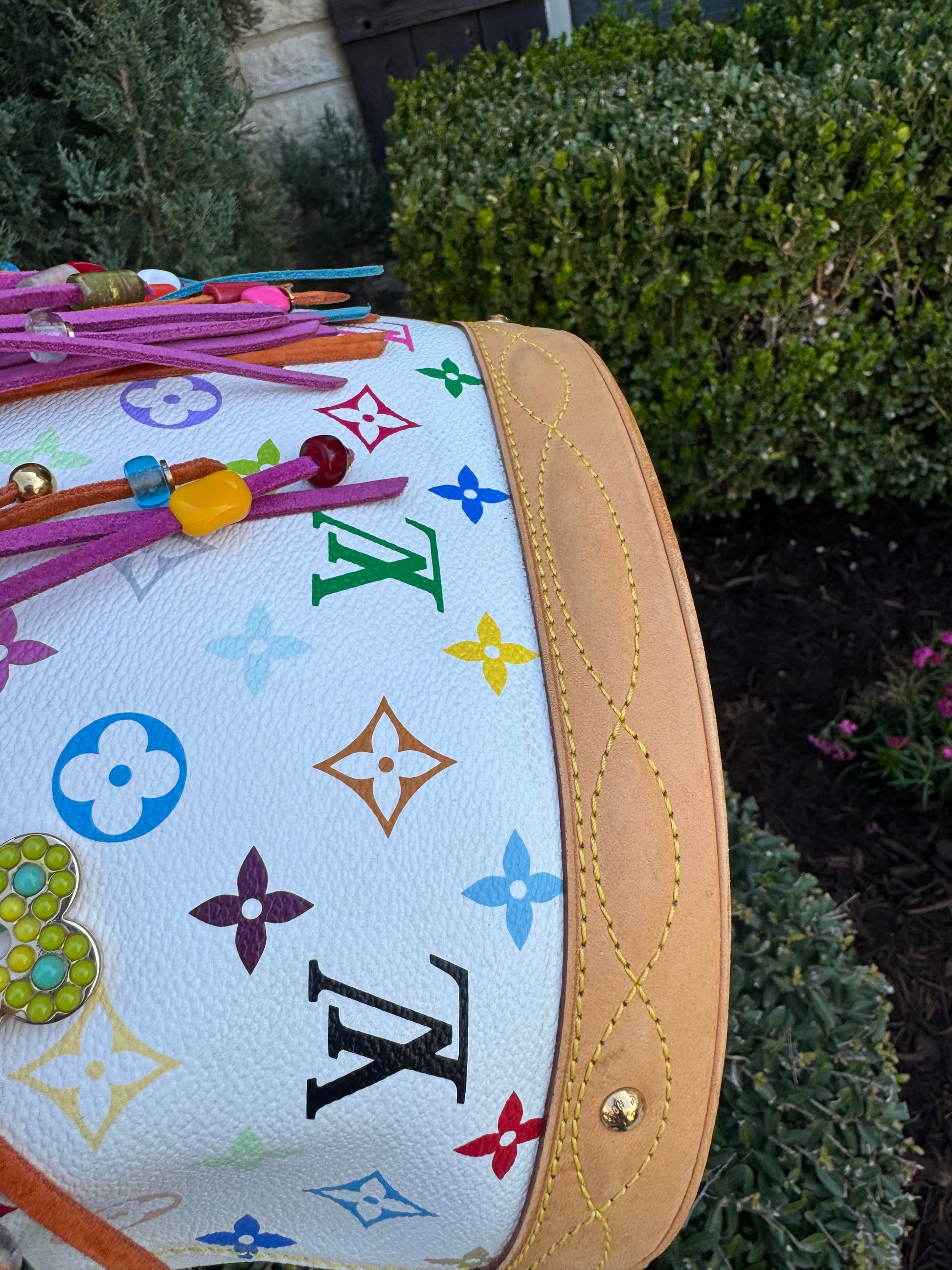 Louis Vuitton Bucket Fringe – Multicolor Monogram Blanc by Takashi Murakami One of the most sought-after and holy grail pieces from the Takashi Murakami x Louis Vuitton collaboration, the Bucket Fringe in Multicolor Blanc is a rare collector’s item. Known for its unique fringe detailing and vibrant multicolor monogram, this bag is a stunning statement piece and one of the most valuable designs from the collection. Due to its rarity and condition, it remains a highly coveted find for serious collectors.