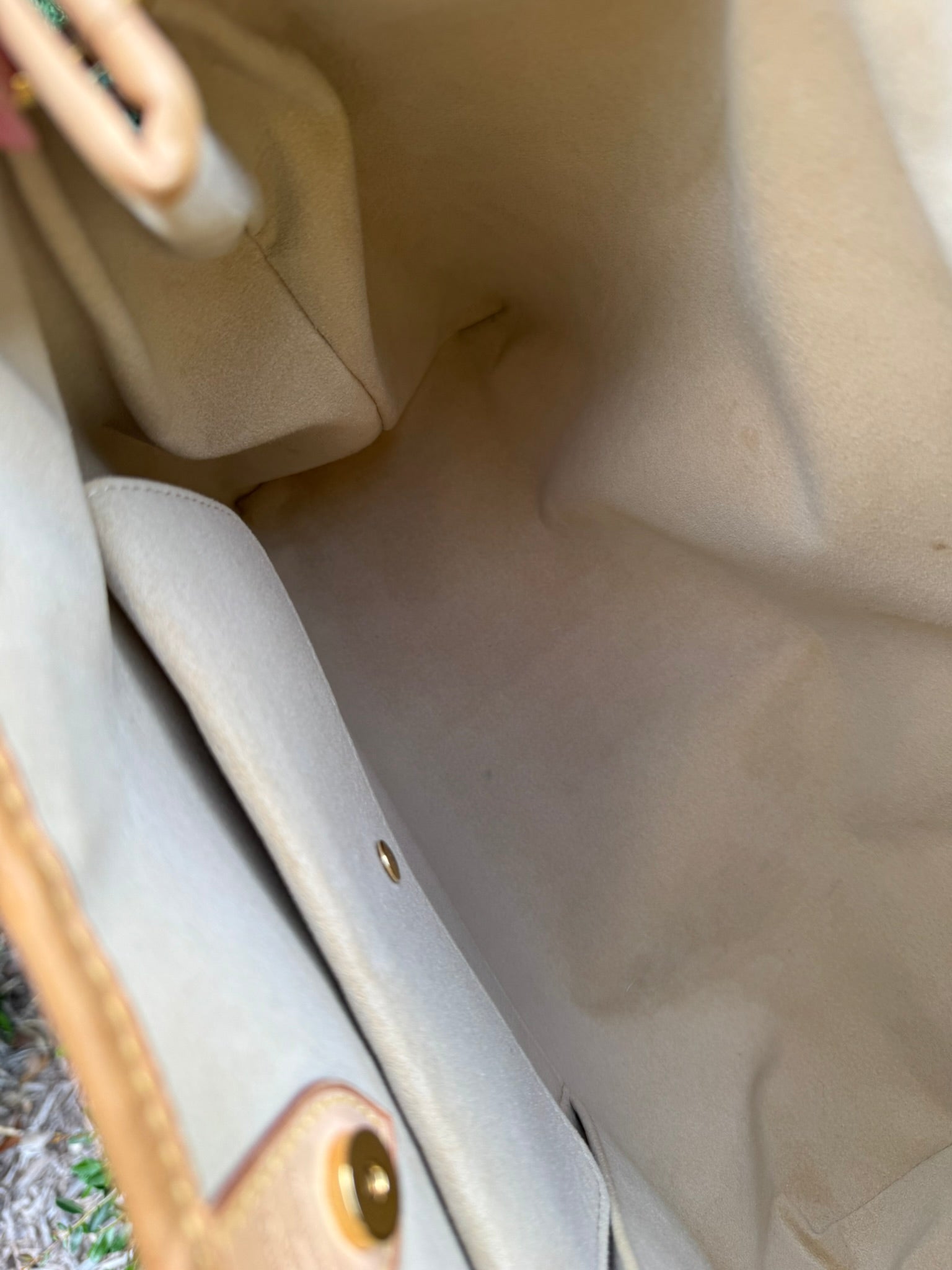 - Vachetta leather has developed a honey patina, with light watermarks and belt marks
