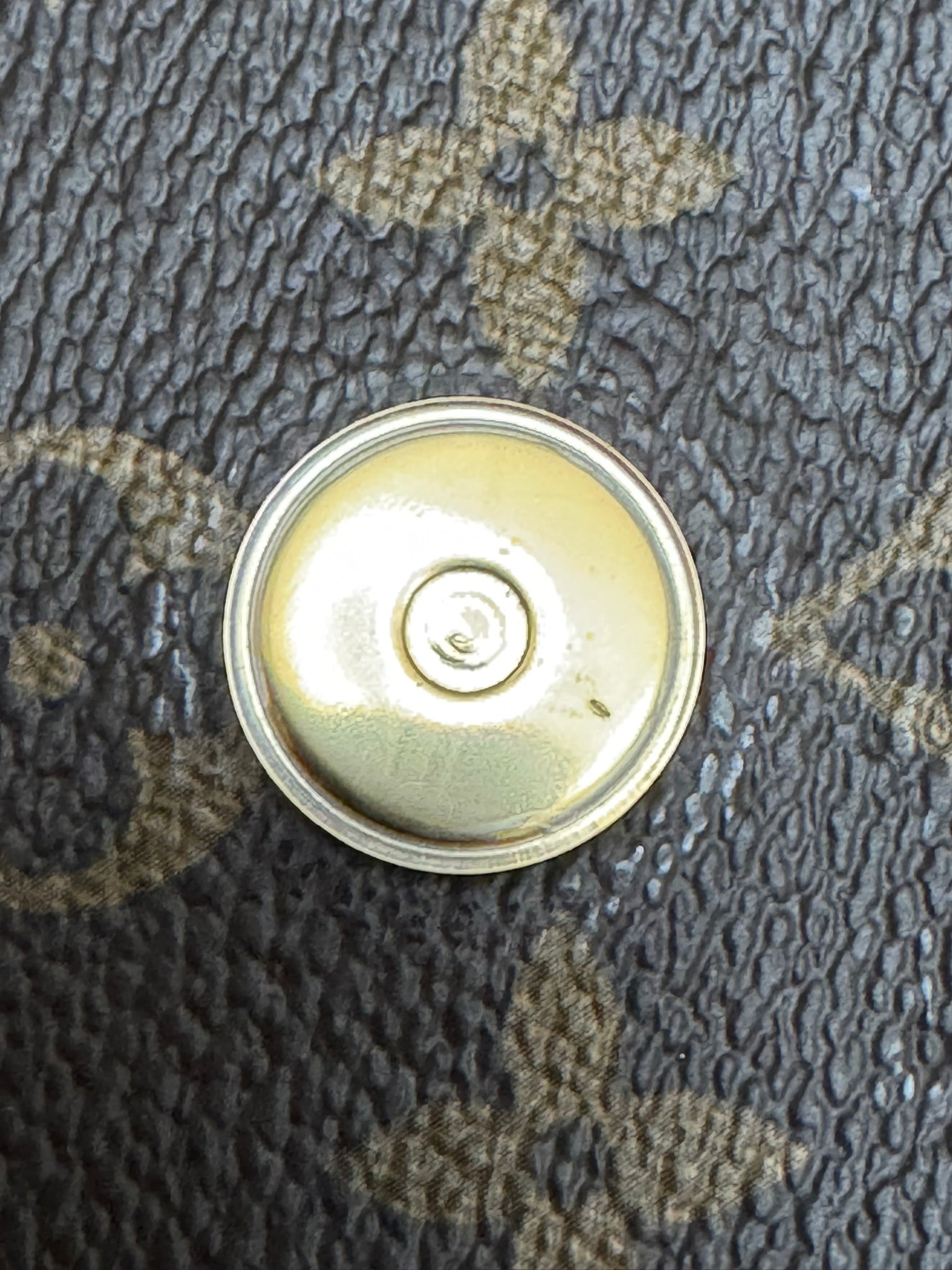 - Gold-tone hardware and padlock closure are shiny, with light hairline scratches
