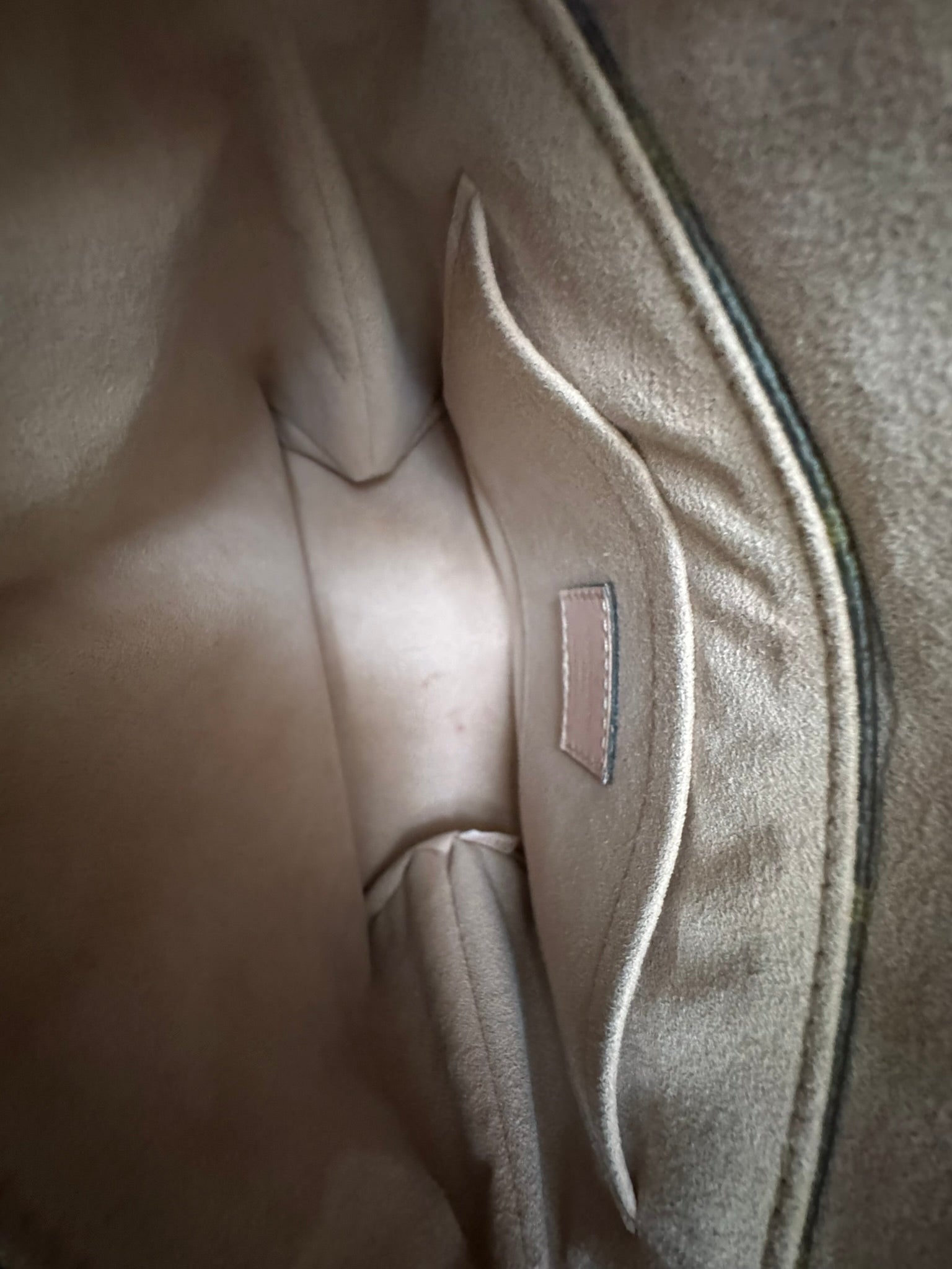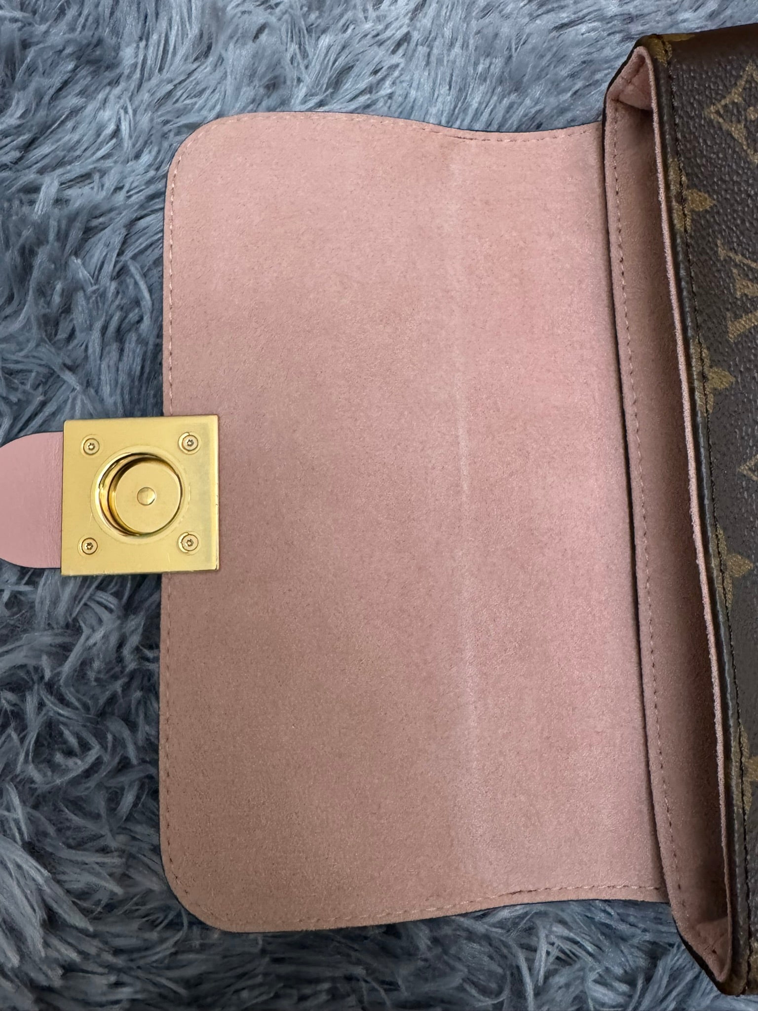 - Monogram canvas body with Rose Poudre calfskin leather flap