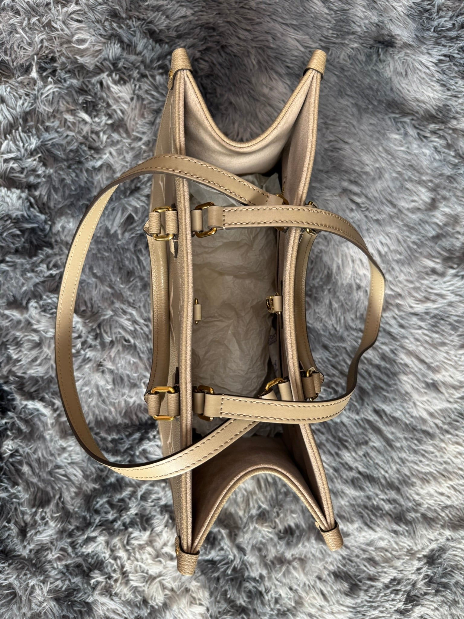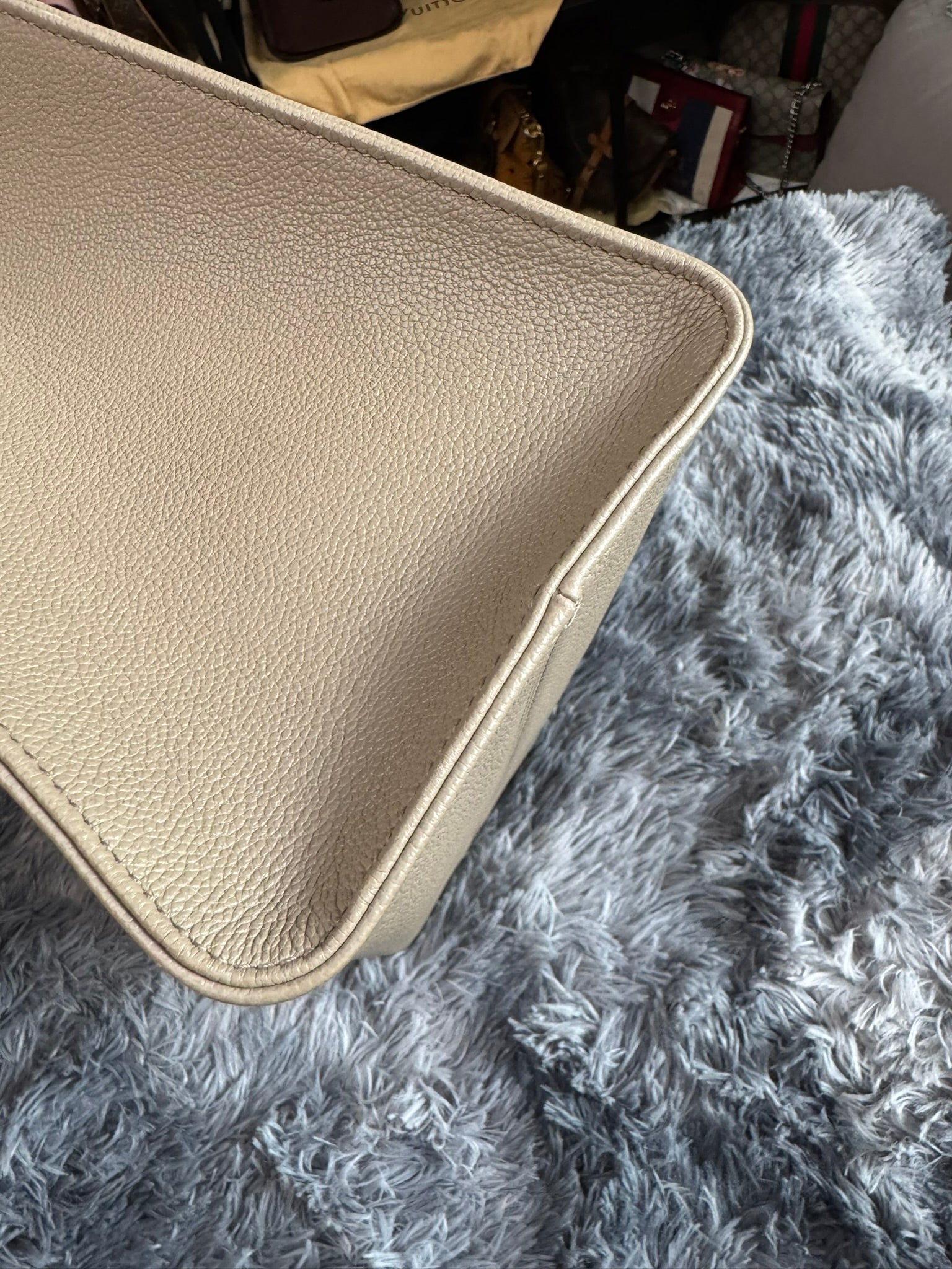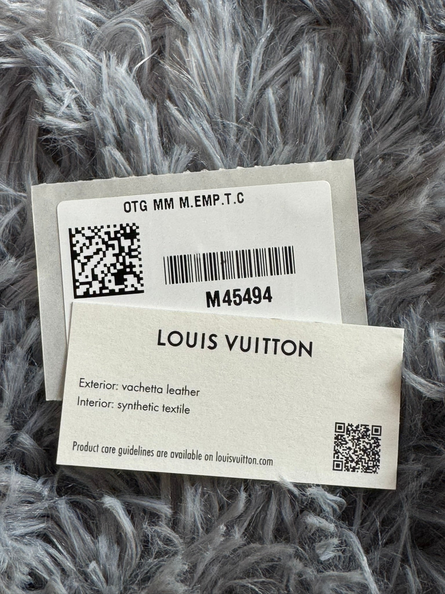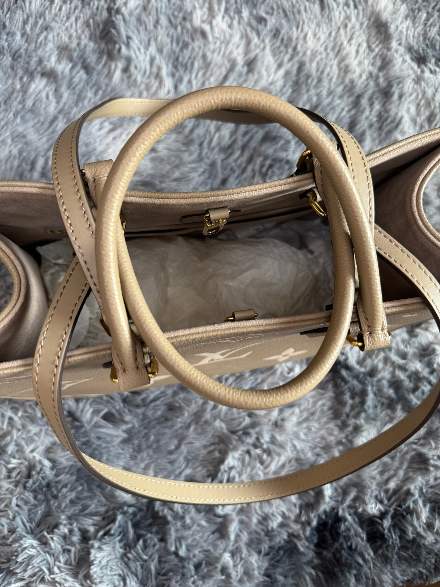 The Louis Vuitton OnTheGo MM in bicolor Monogram Empreinte leather is a modern, structured tote that balances everyday function with refined elegance. Crafted from embossed grained cowhide leather in a soft Tourterelle (taupe-grey) and Cream colorway, this version of the OTG MM is both sophisticated and versatile. The bag features the iconic oversized and classic monogram motifs, twin top handles, and long leather shoulder straps, allowing it to be carried by hand, over the shoulder, or crossbody. The interior is roomy and well-organized, making it ideal for work, errands, or travel.