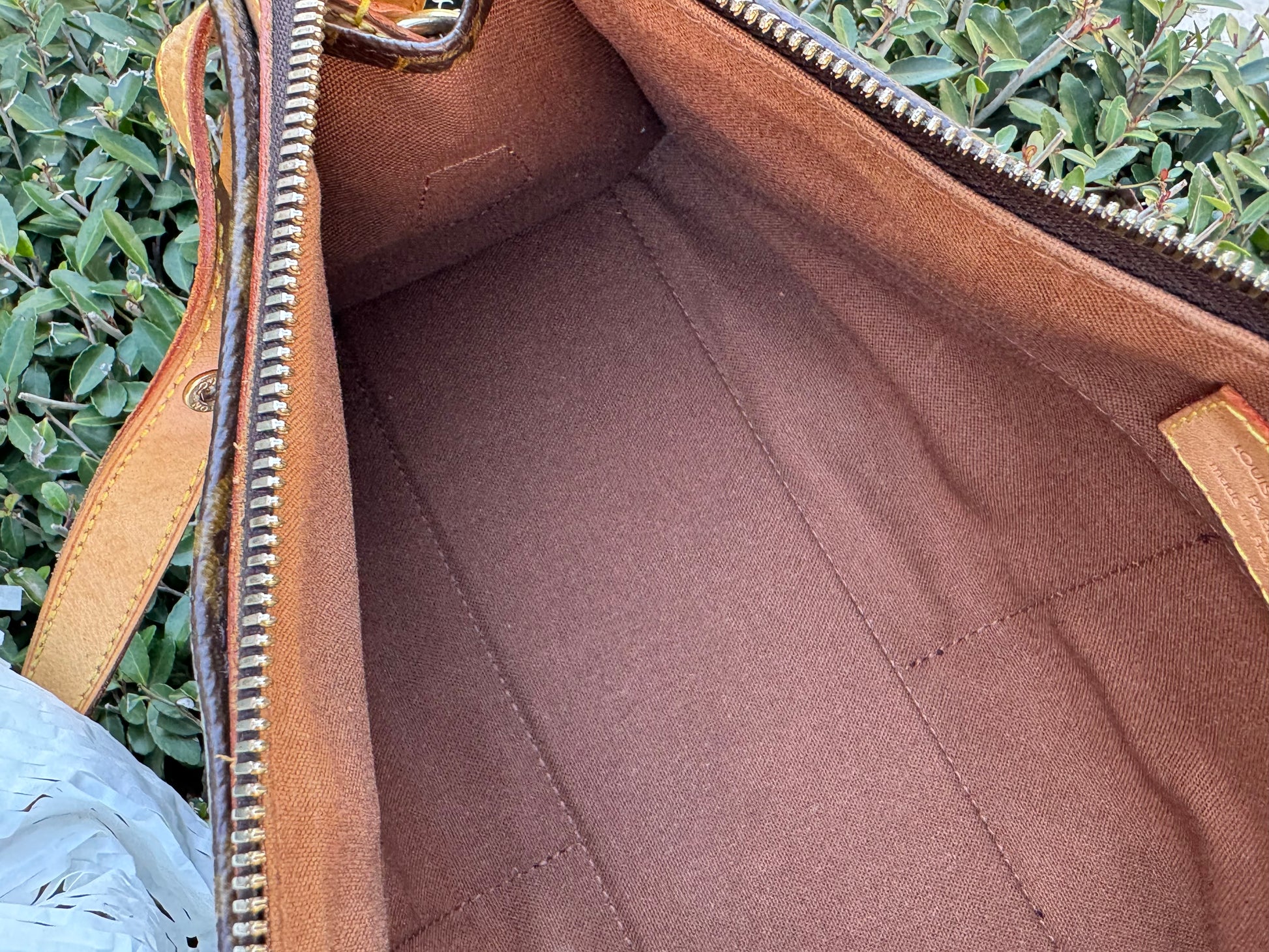 - Vachetta leather has developed a honey patina, with some light watermarks