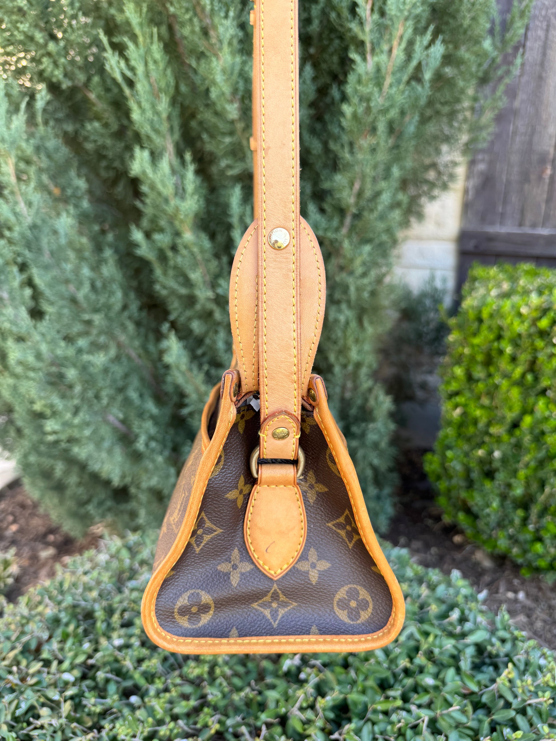- Classic monogram canvas with natural vachetta leather trim