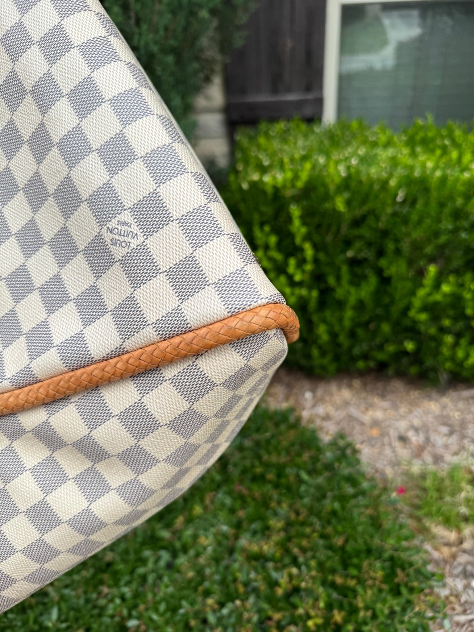 - Damier Azur coated canvas with natural vachetta leather trim