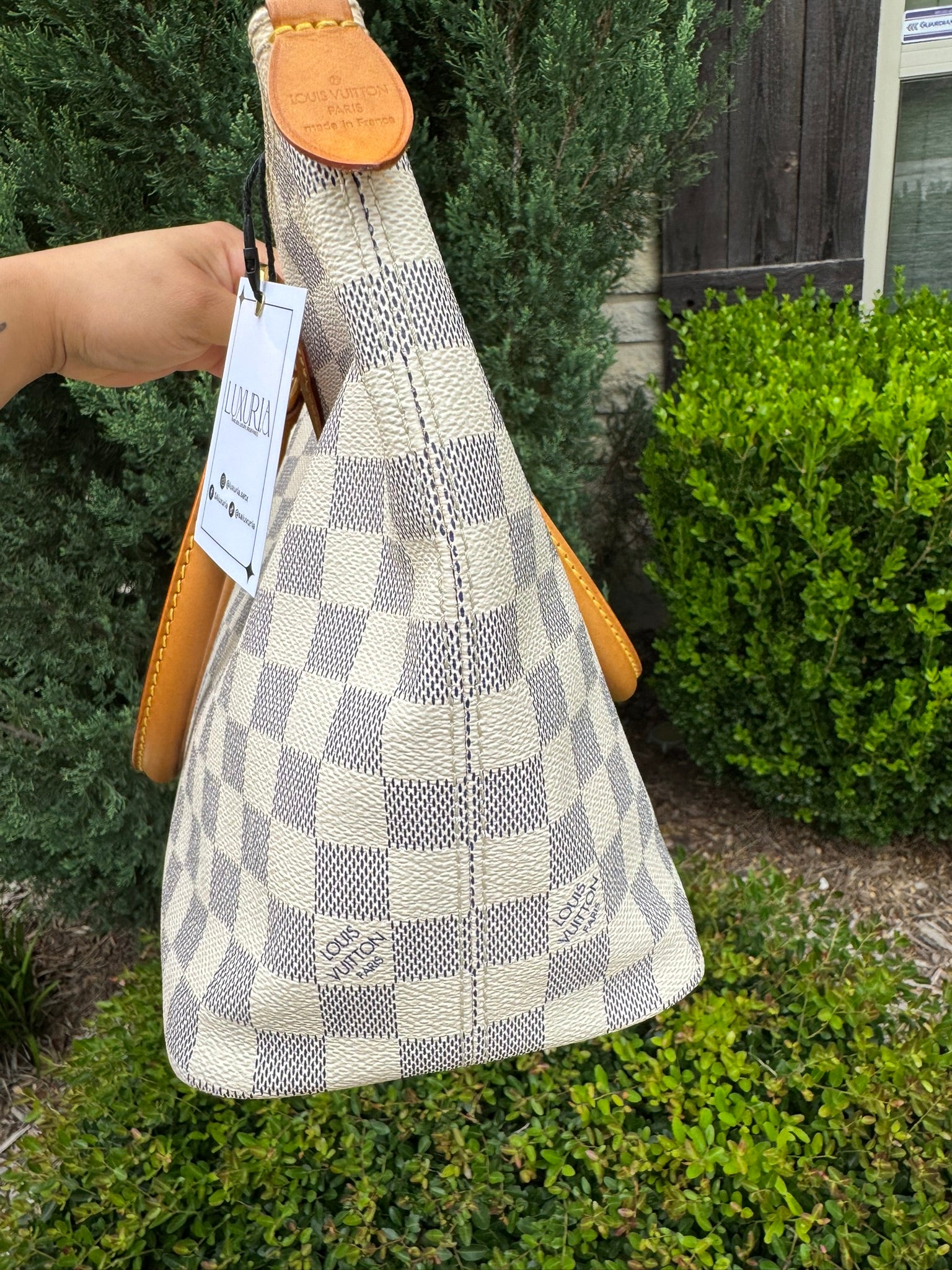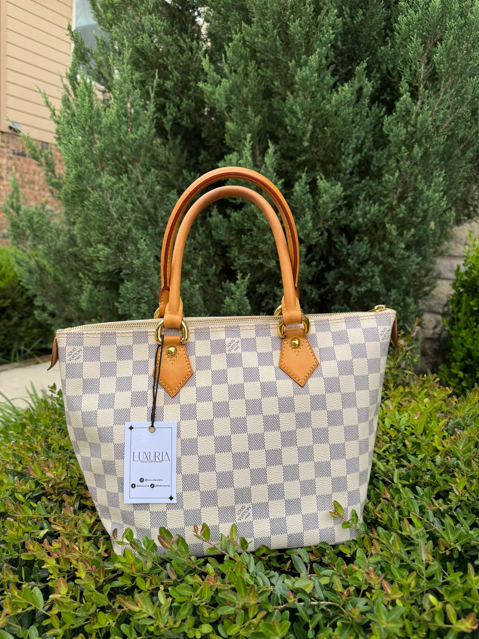 - Damier Azur coated canvas with natural vachetta leather trim