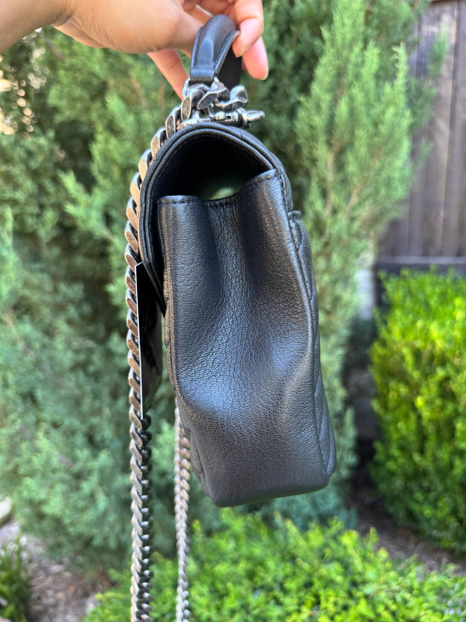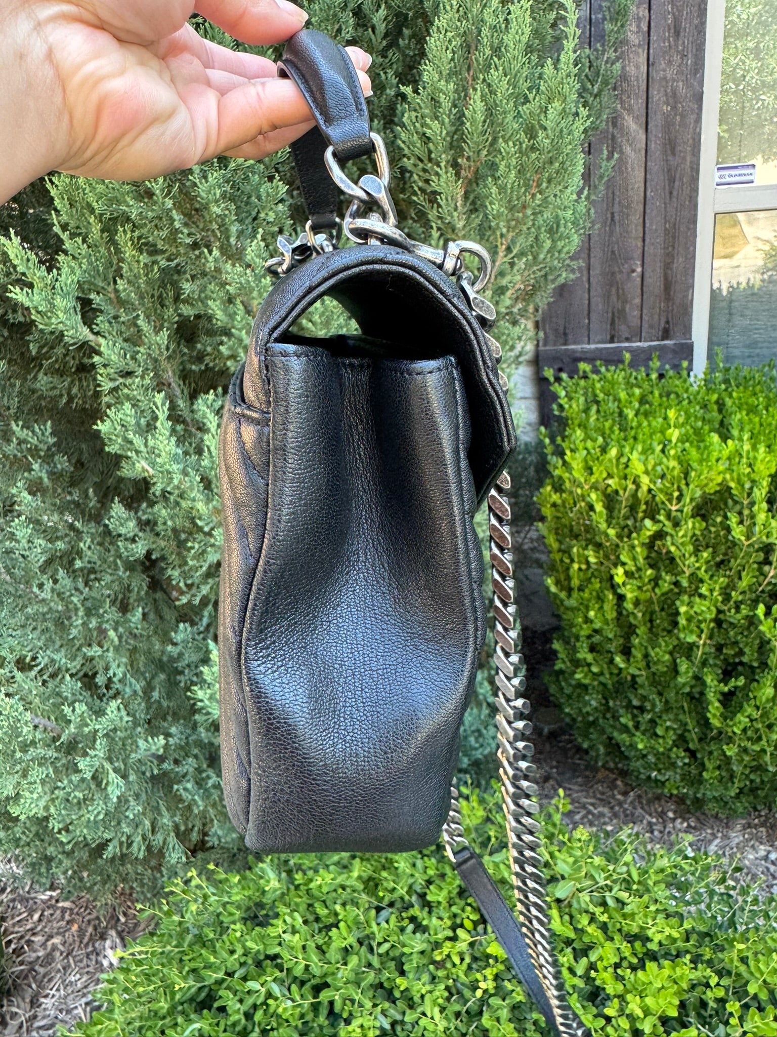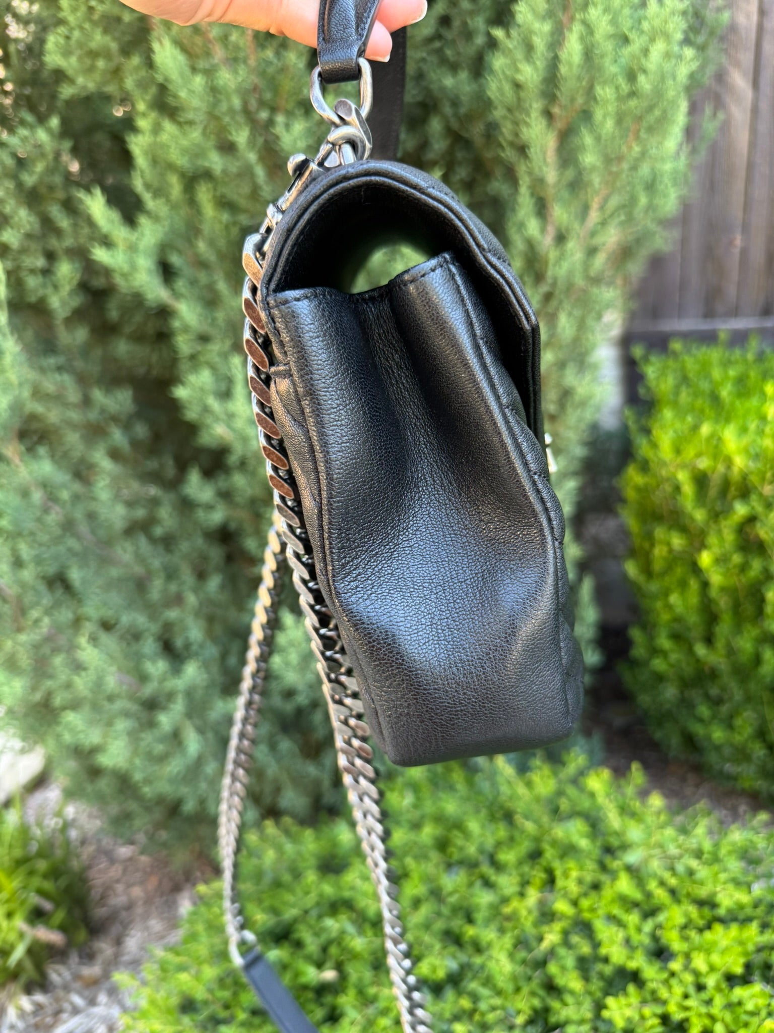 - Top handle and removable chain/leather strap