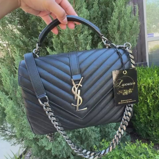 The Saint Laurent College Medium is an iconic piece featuring chevron-quilted leather, the signature interlocking YSL logo, and a versatile design that transitions effortlessly from day to night. With both a top handle and a removable chain/leather strap, it offers multiple ways to wear—handheld, on the shoulder, or crossbody.
